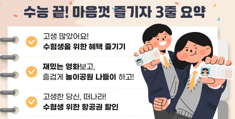 수능이라는 긴 마라톤을 완주한 2025학년도 수험생 여러분, 정말 고생 많으셨습니다! 💐 이제 무거운 짐을 내려놓고 마음껏 즐길 시간입니다. 1년 동안 고생한 자신에게 보상할 수 있도록, 다양한 기업들이 진행하는 수험생 할인 이벤트를 한눈에 보기 쉽게 정리했습니다. 이 혜택들, 대부분 12월 중순까지만 진행되니 절대 놓치지 마세요!