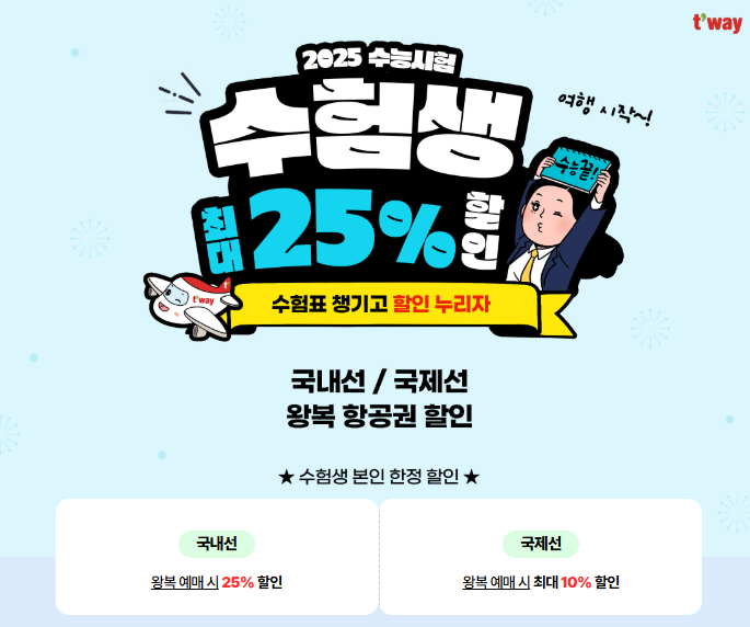 - 꿀팁: 항공권 예매 시 반드시 '수험생 할인 이벤트' 메뉴를 선택해야 합니다.